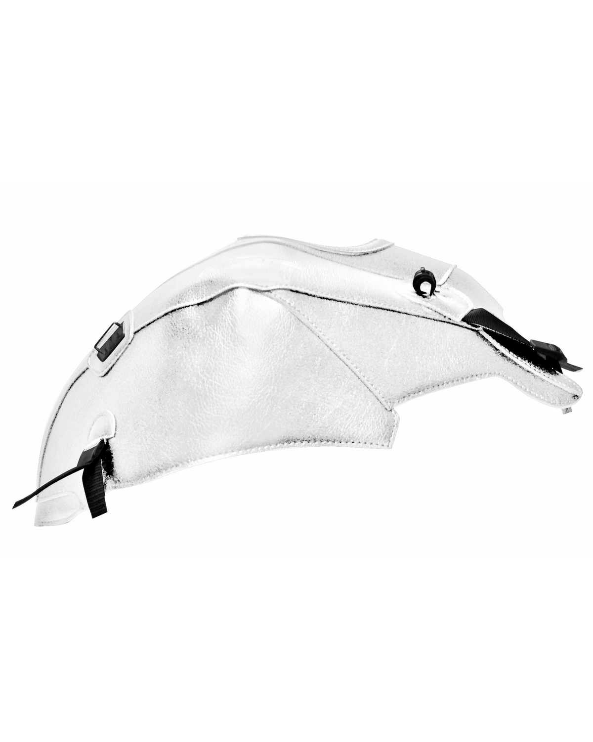 Passer la sangle autour de la colonne de direction en évitant de pincer les câbles. Tendre à l'avant et à l'arrière sous la selle en ajustant le trou du bouchon de réservoir. Tendre de chaque côté progressivement, pour que le protège-réservoir épouse exactement la forme du réservoir.